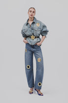grommets , these jeans feature a curved outseam for a playful bubble effect.