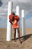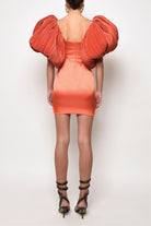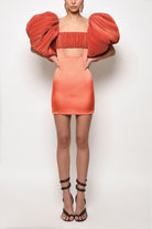Aerin wears our pleated short sleeve peek-a-boo cut-out mini dress, featuring a voluminous puff sleeve, square neckline, with a pleated panel in front.