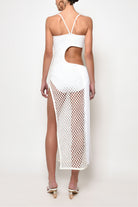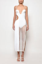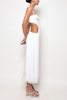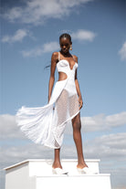 Aerin wears our deep cut bustier asymmetrical Kesia dress featuring curve defining side cut out, with fringe details, high slit, and bodysuit under.