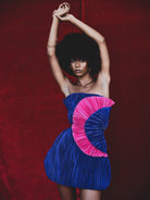 - Sculptural fit, straight neck, strapless, sculpted pleated layers, bubble hem, mini hem, lined