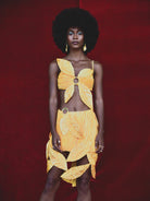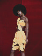 - Sculptural fit, asymmetric neckline, spaghetti straps, ruched, pleated leaf detailing, ring details, cutout, knee-length hem, lined