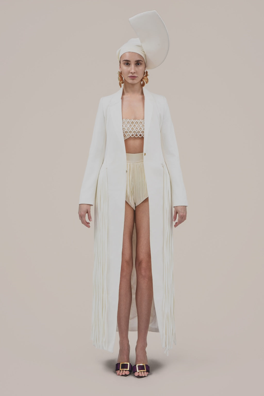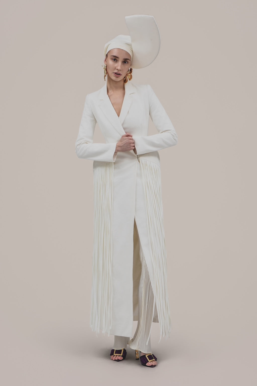 Make a statement with our wool coat featuring a dramatic hourglass silhouette with a cinched waist and shaped hips, bold shoulders, asymmetrical collar, fringe and gold leaf pin detail.