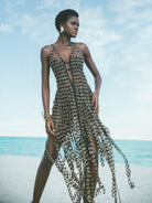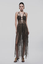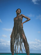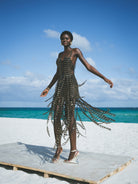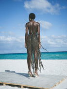 Nori dress has a V neckline, backless design, A-line silhouette and back zip closure featuring Hand sewn black and gold embroidered 3D eyelet trim.