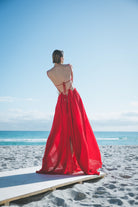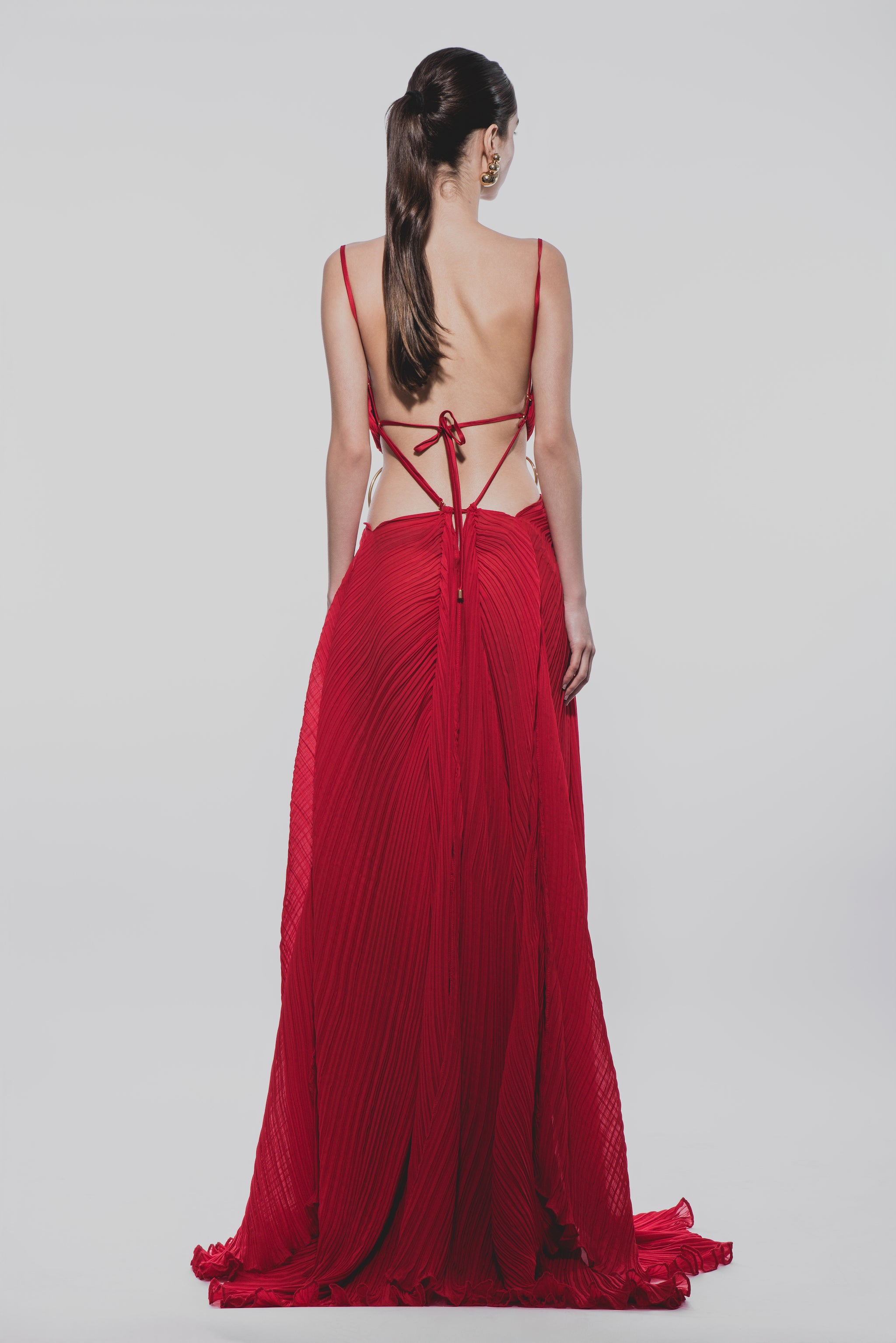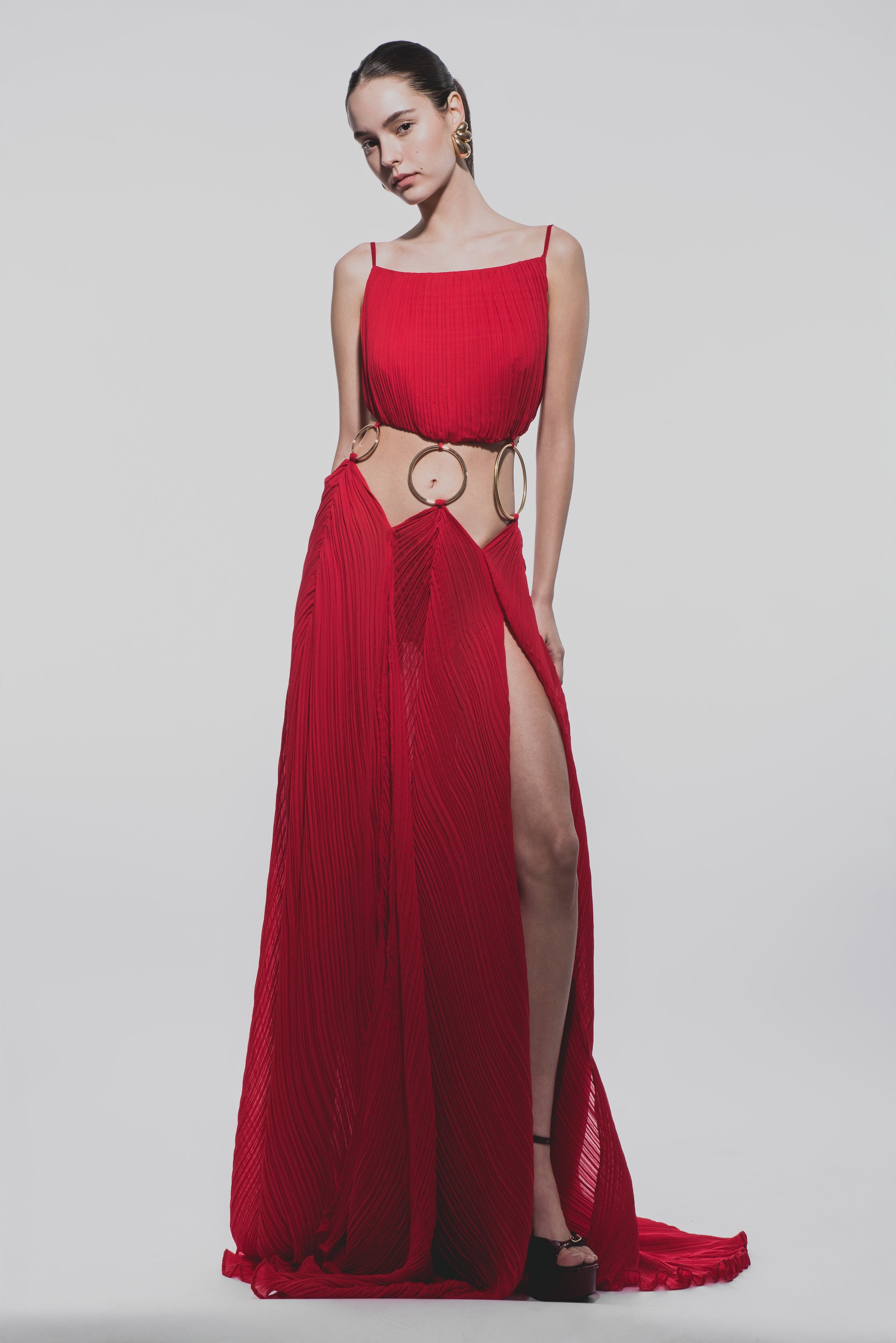 Rubina fully lined top, long maxi dress in our signature mushroom pleat featuring 3 different ring size at the waist line and slip on both sides, Open back with string to adjust.