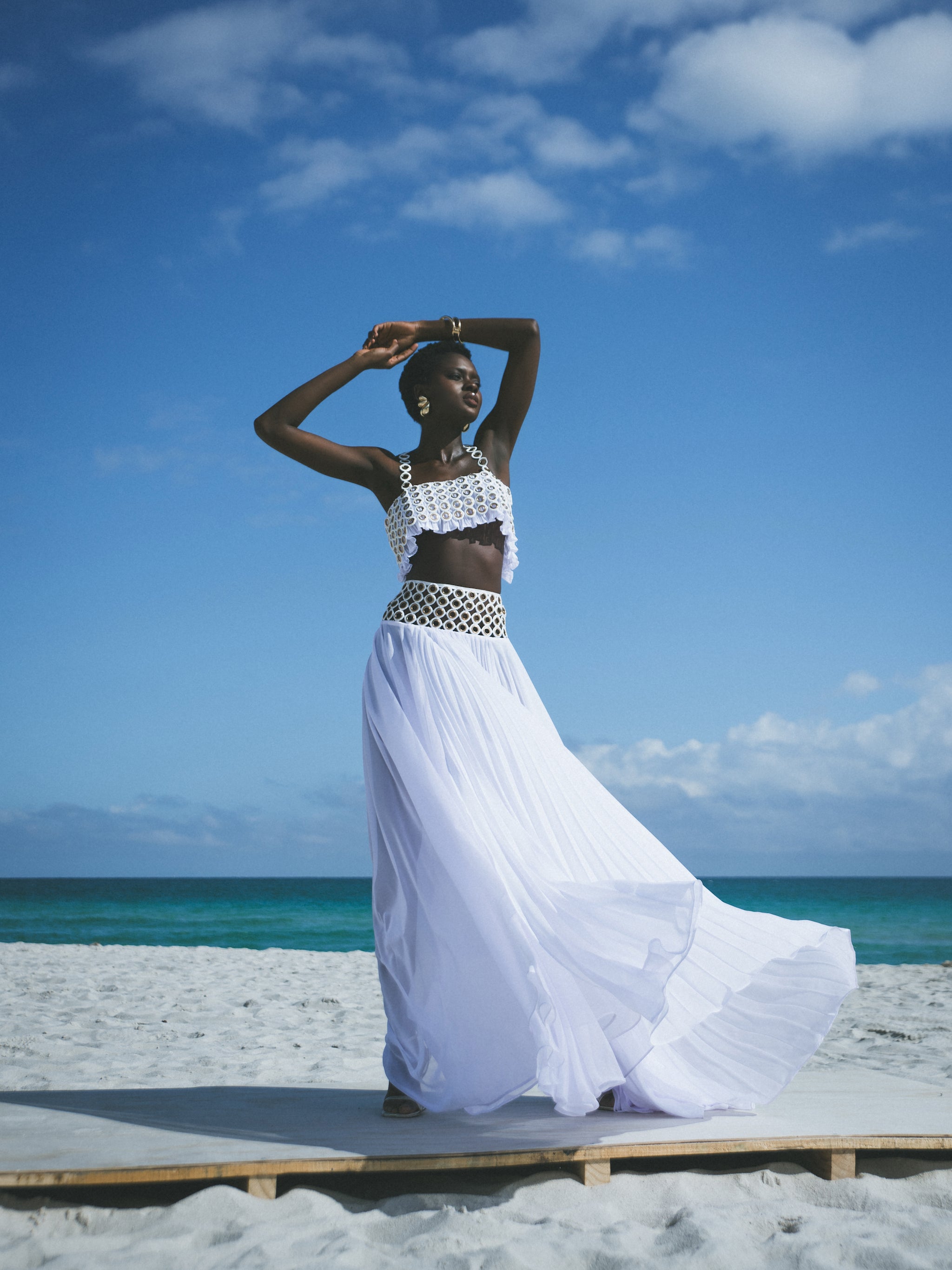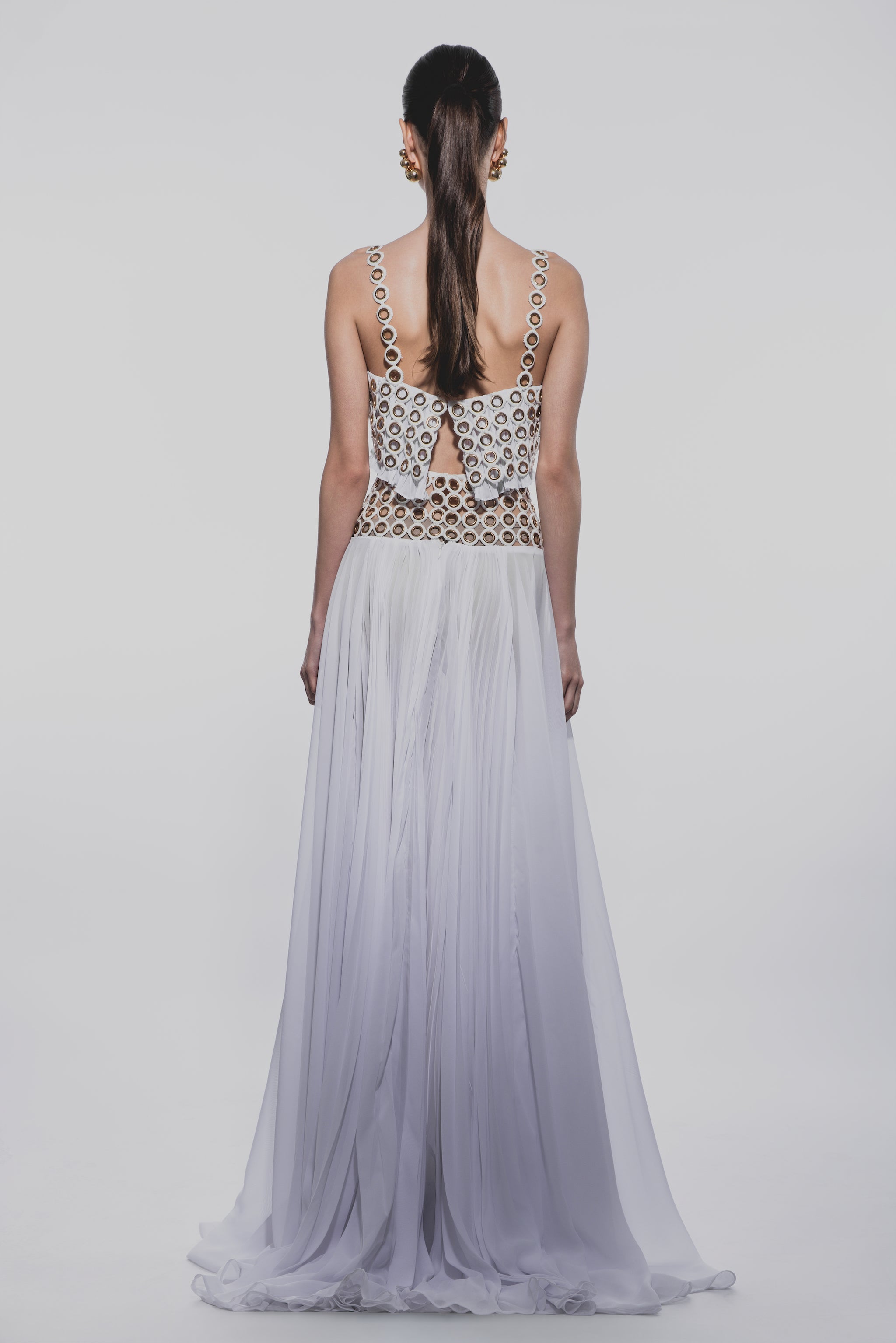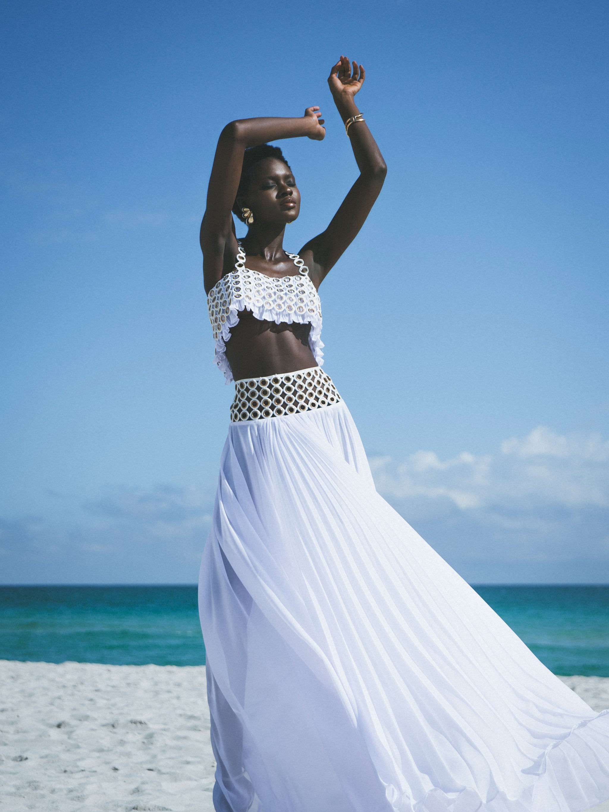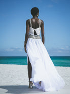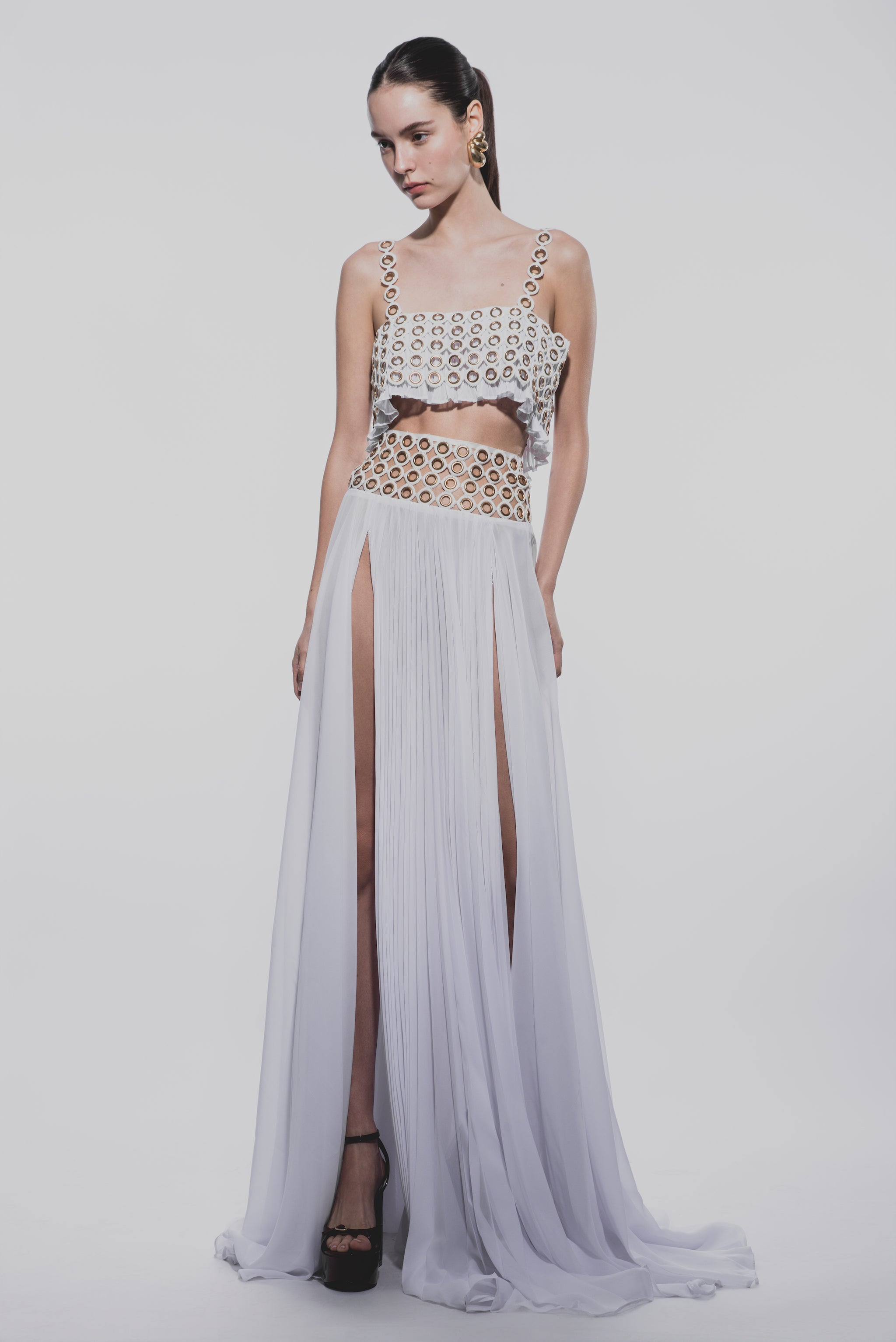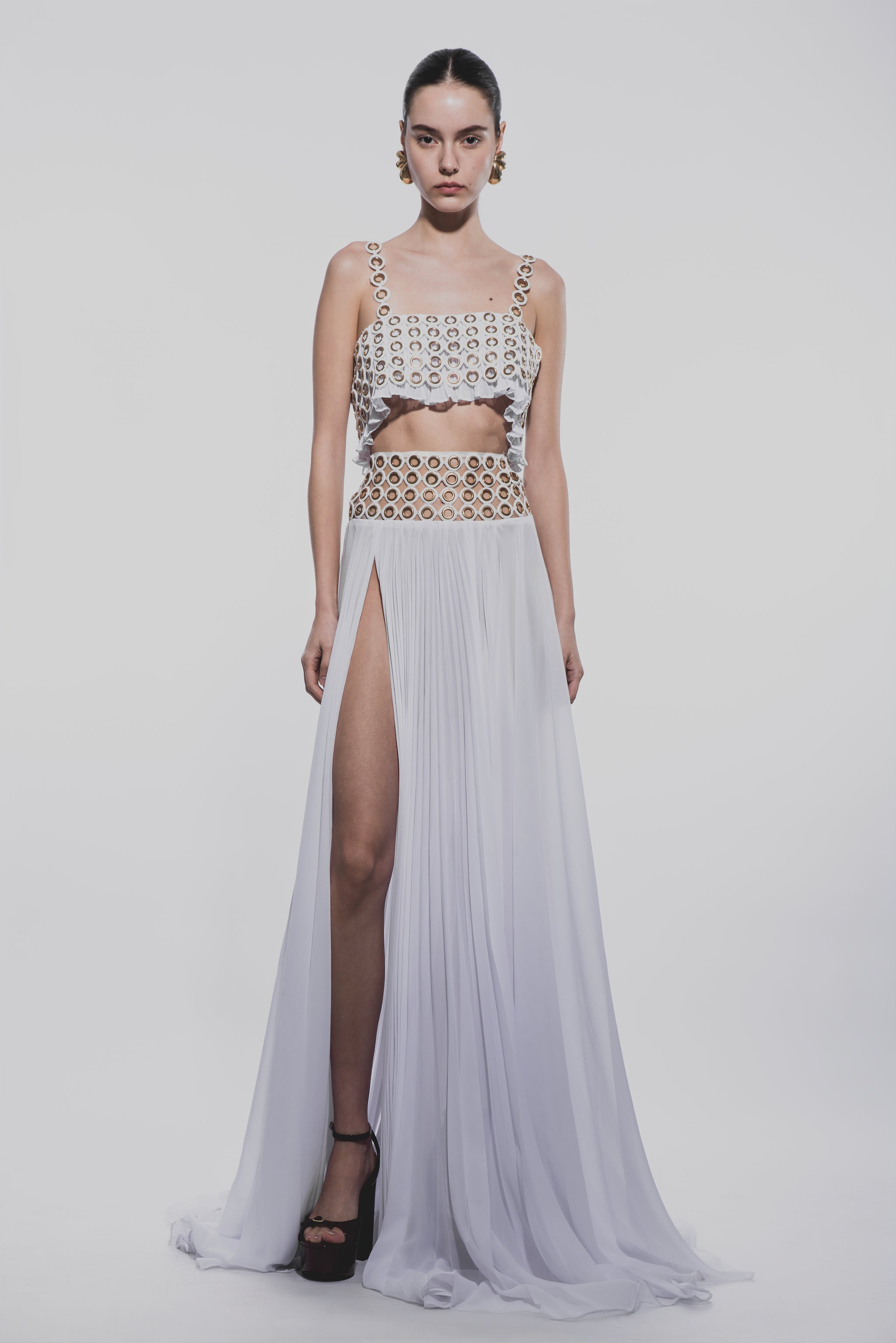 Serena maxi skirt featuring white and gold embroidered guipure 3D eyelet trim and high slit.