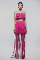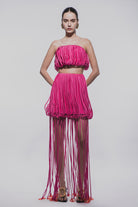 Naia crop top features fringe made with stretch charmeuse fabric with boning detail for support.