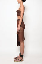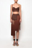 Aerin wears a lace see-through pencil skirt with layers of fringe details.