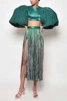 Aerin wears our Jamilia midi Skirt in long Layered rayon fringe panel.