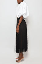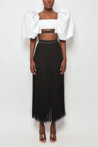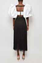Suzana wears our Jamilia midi Skirt in long Layered rayon fringe panel.