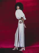 - Slim fit, high rise, cutout hips, fringe hip detailing, grid lace, maxi hem, lined
