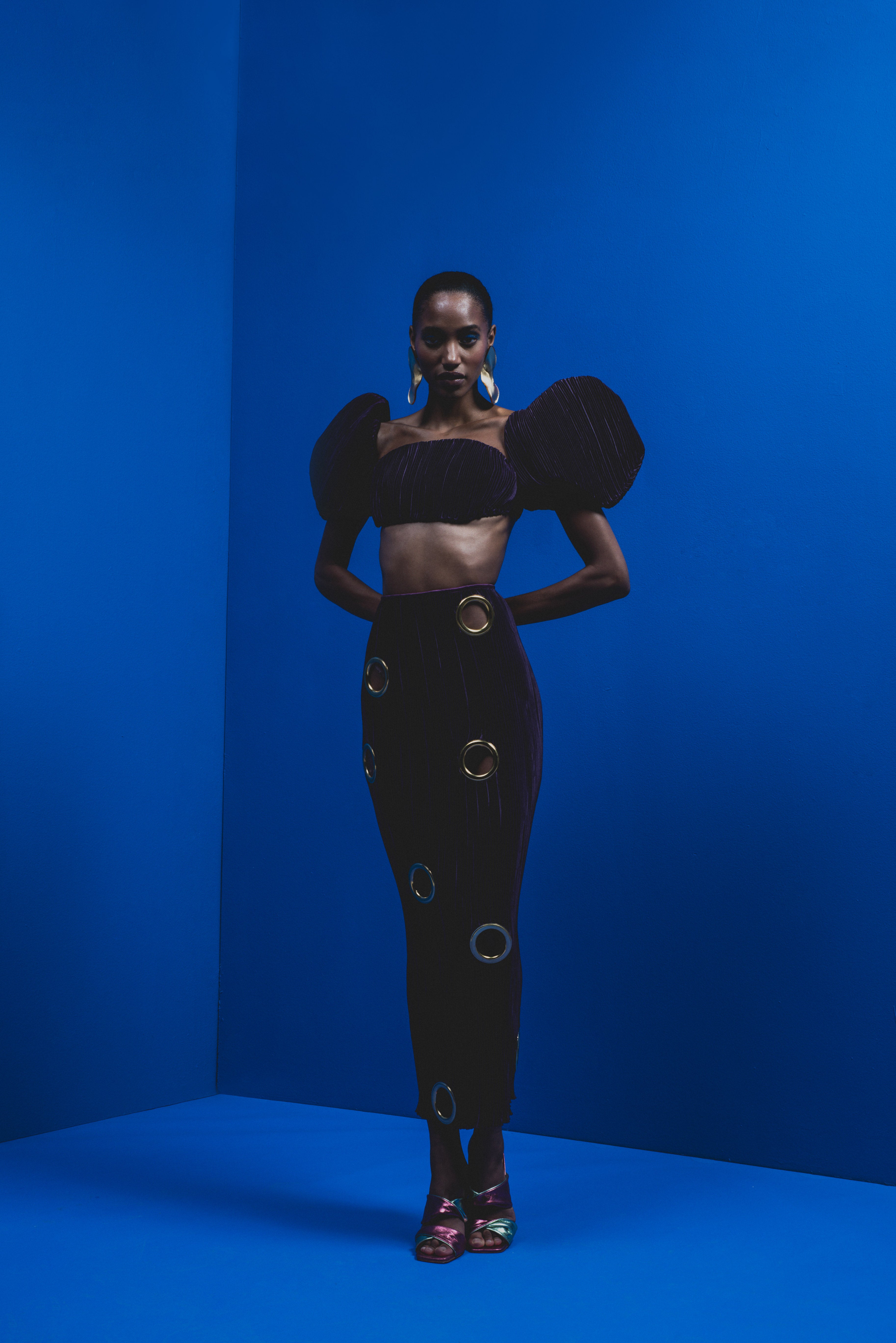 Introducing the Nneka skirt, a luxuriously slim-fit piece with a high rise and elegant midi hem. Adorned with gold rings and aubergine color, this skirt is perfect for any sophisticated occasion. The concealed back snap fastening and exposed lining add a touch of exclusivity.