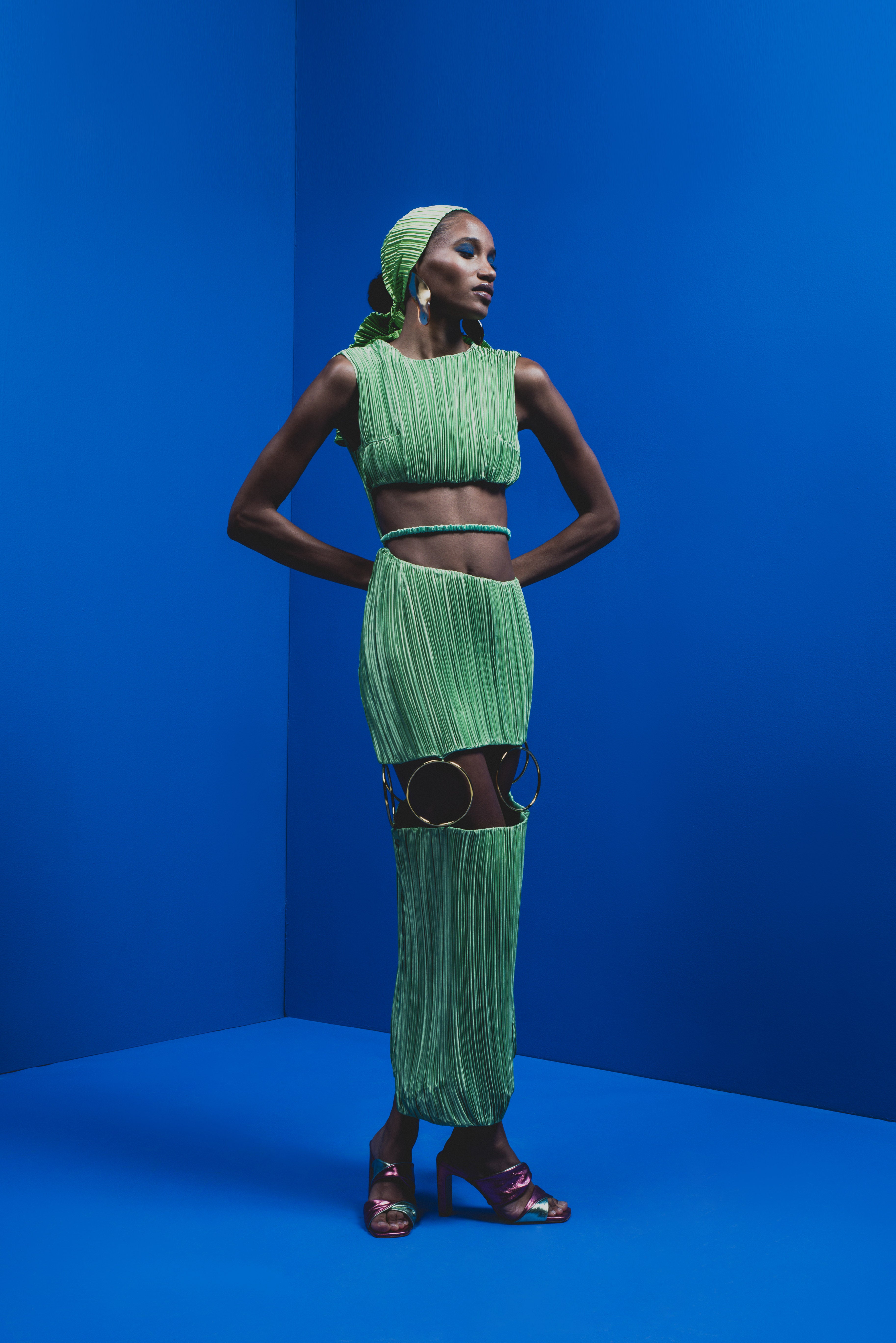 Featured in the SS23 lookbook, this Ola Dress is an elegant Perrot green color. Its slim fit, rounded neckline, and pleated design give it a sophisticated and exclusive look. The dress also features a twisted and cutout design, along with a gold ring and maxi hem. It is lined and has a concealed metal tape fastening.