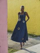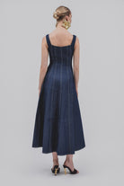 Make a statement with our denim midi dress featuring asoft square neckline, gold metalgrommets, panel seams detailswith A line skirt.