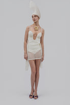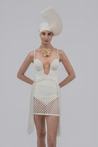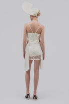 Make a statement with our deep cut bustier asymmetrical Kesia mini dress featuring curve defining side cut outs, with fringe details, and bodysuit for coverage.