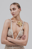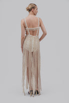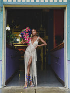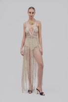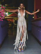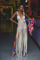 Nori dress has a V neckline, backless design, A-line silhouette and back zip closure featuring Hand sewn white and gold embroidered 3D eyelet trim.