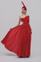 A line floor length dress featuring delicate pleated flower top, with gold ring detail, and spaghetti straps. concealed zipper in back