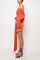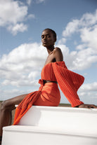 Aeron wears a fully pleated off-shoulder Ada crop top featuring exaggerated balloon sleeves with slit detail.