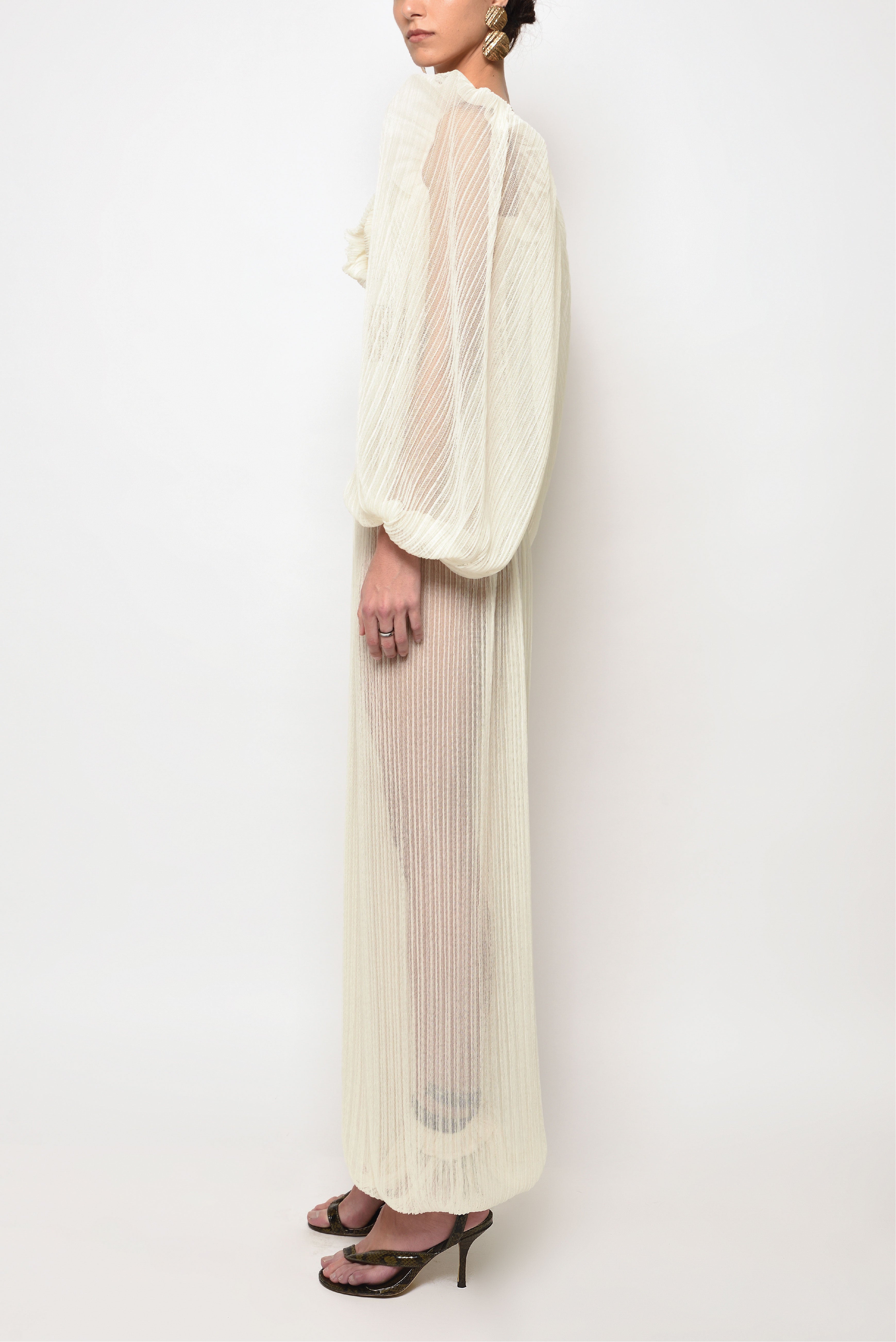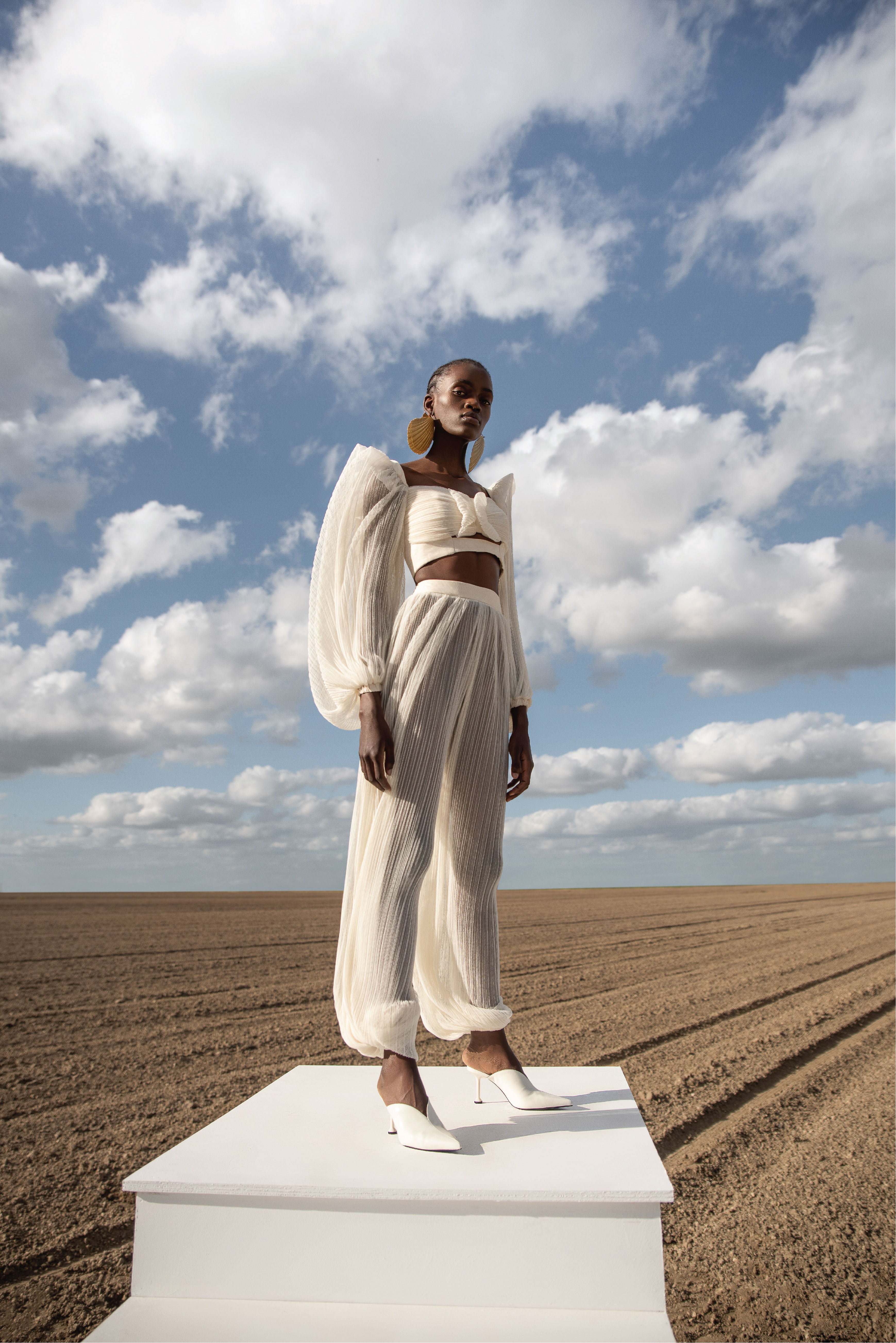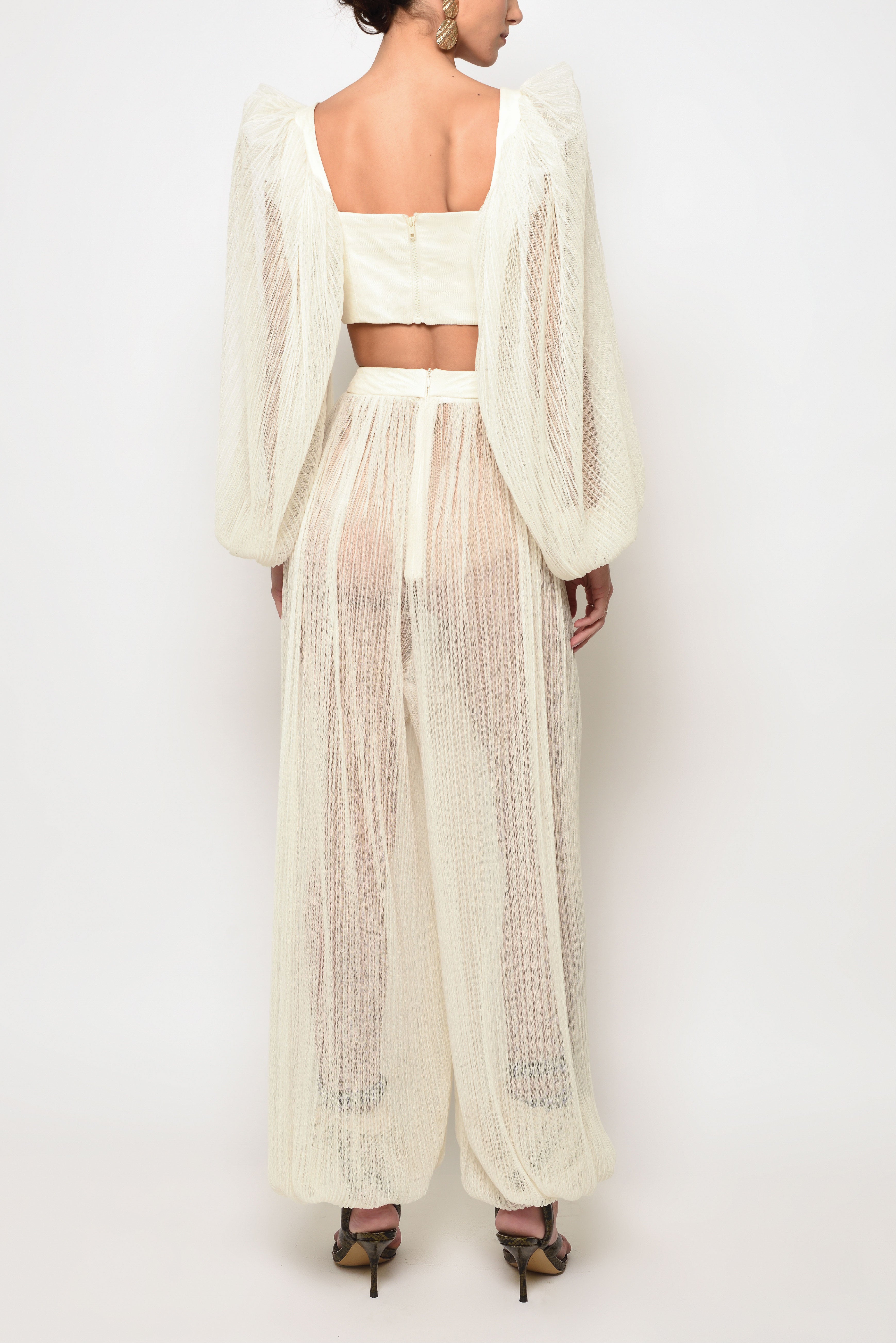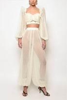 Aerin Wears our Amara Sheer pleated tule crop top with peek-a-boo cut out and exaggerated puff balloon sleeves.