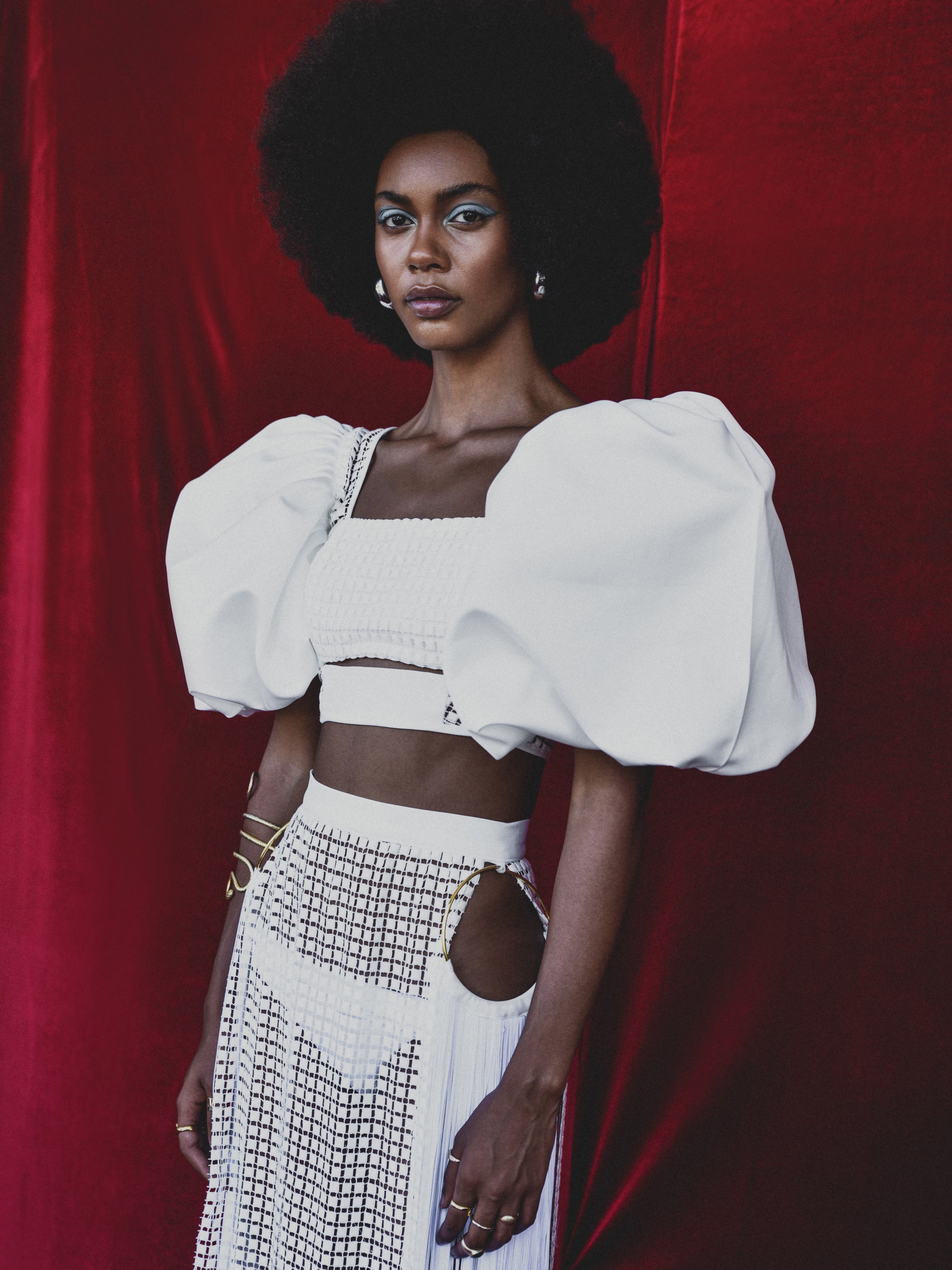 - Sculptural fit, square neck, oversized puff short sleeves, grid lace, cutout, cropped hem, lined