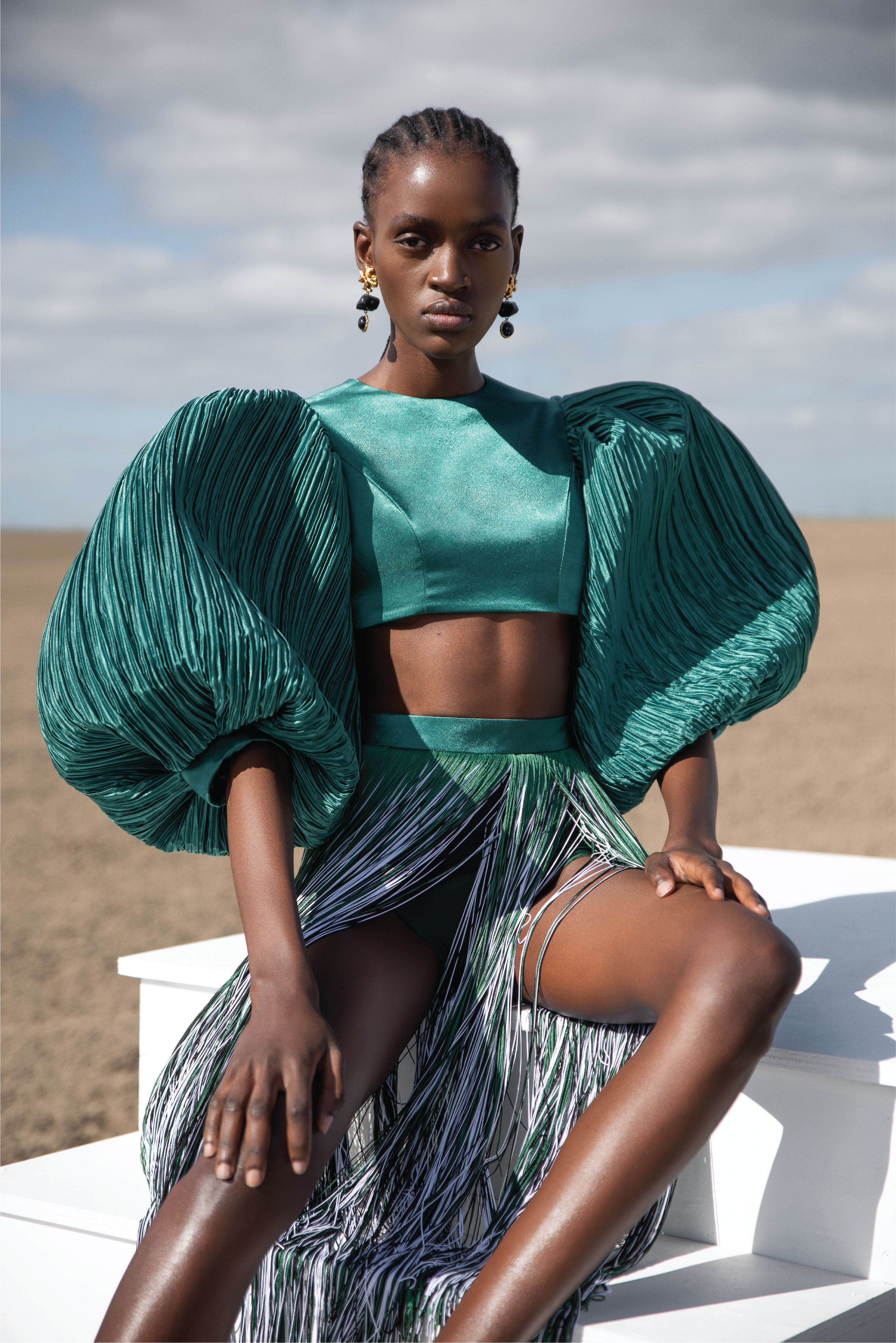 Aerin wears our Neema pleated balloon short sleeve crop top featuring voluminous puff sleeves, and an open back.