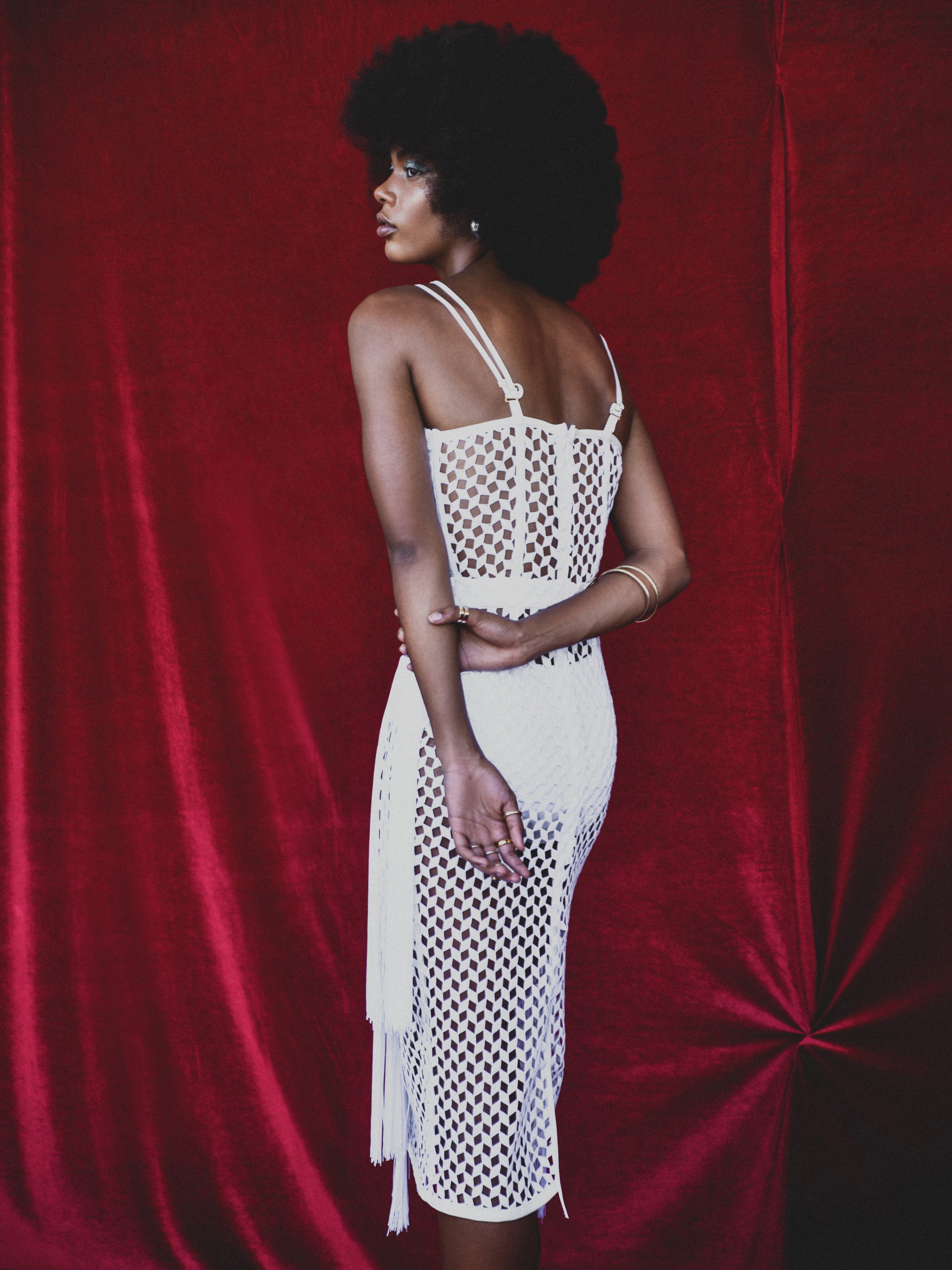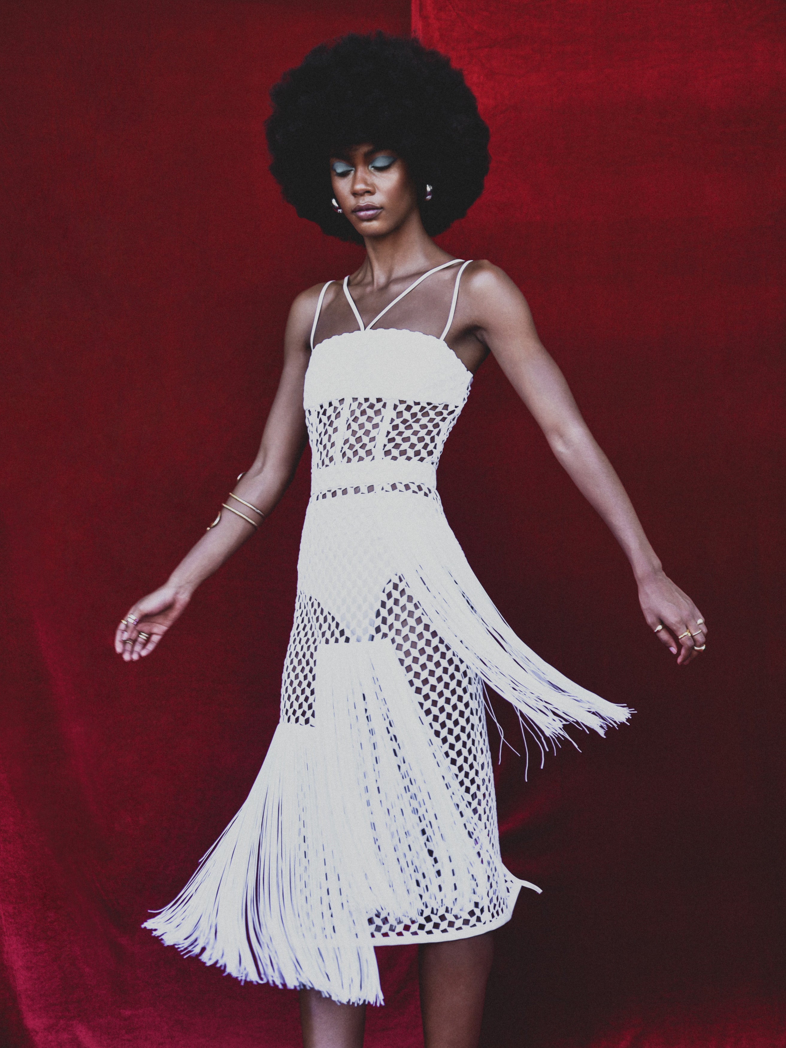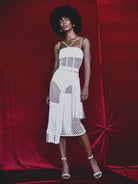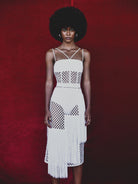 - Slim fit, straight neck, double spaghetti straps, grid lace, fringe details, midi hem, unlined