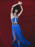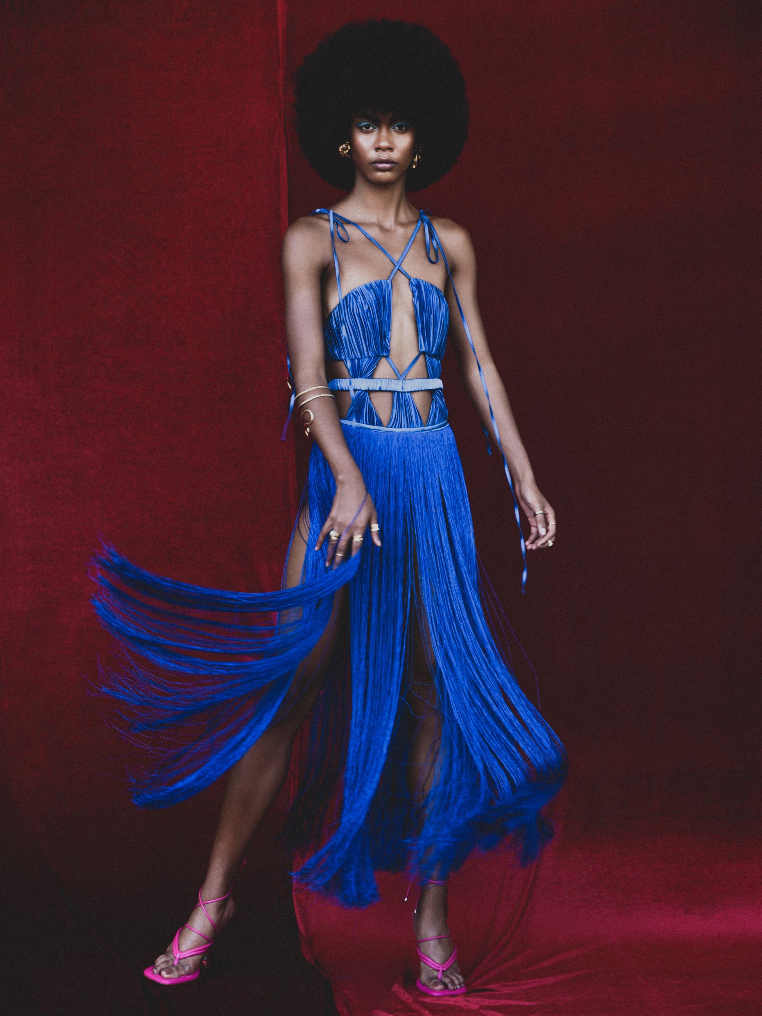- Slim fit, rounded neckline, crossed spaghetti straps, pleated, twisted, cutout, fringe, maxi hem, lined