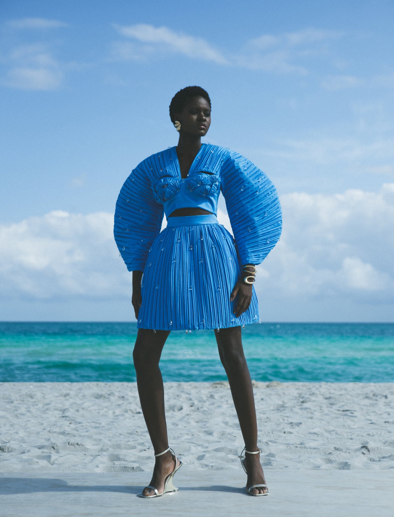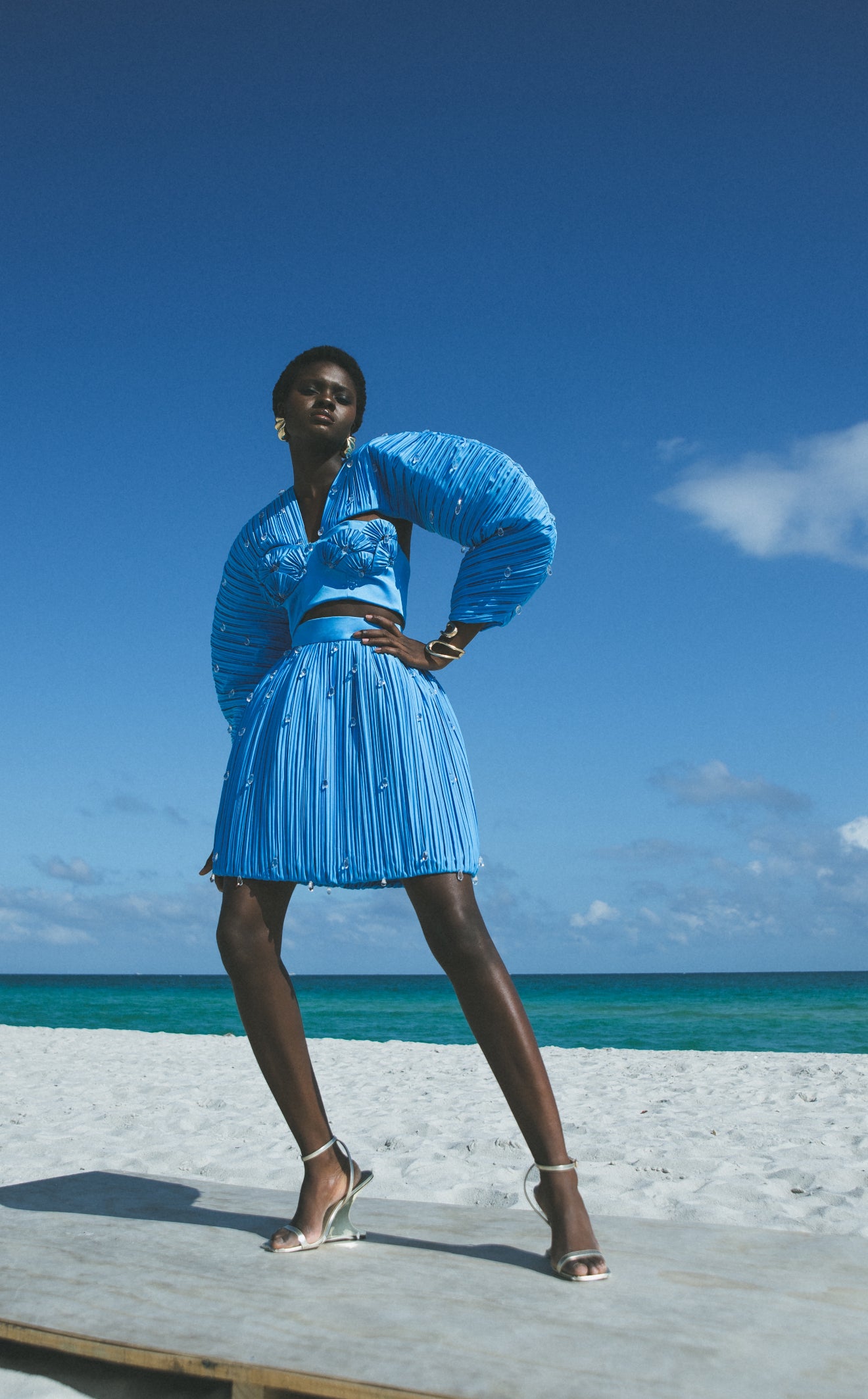 Athena high-waisted bubble skirt in our signature mushroom pleats featuring hand beaded crystal all over skirt