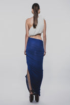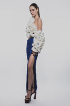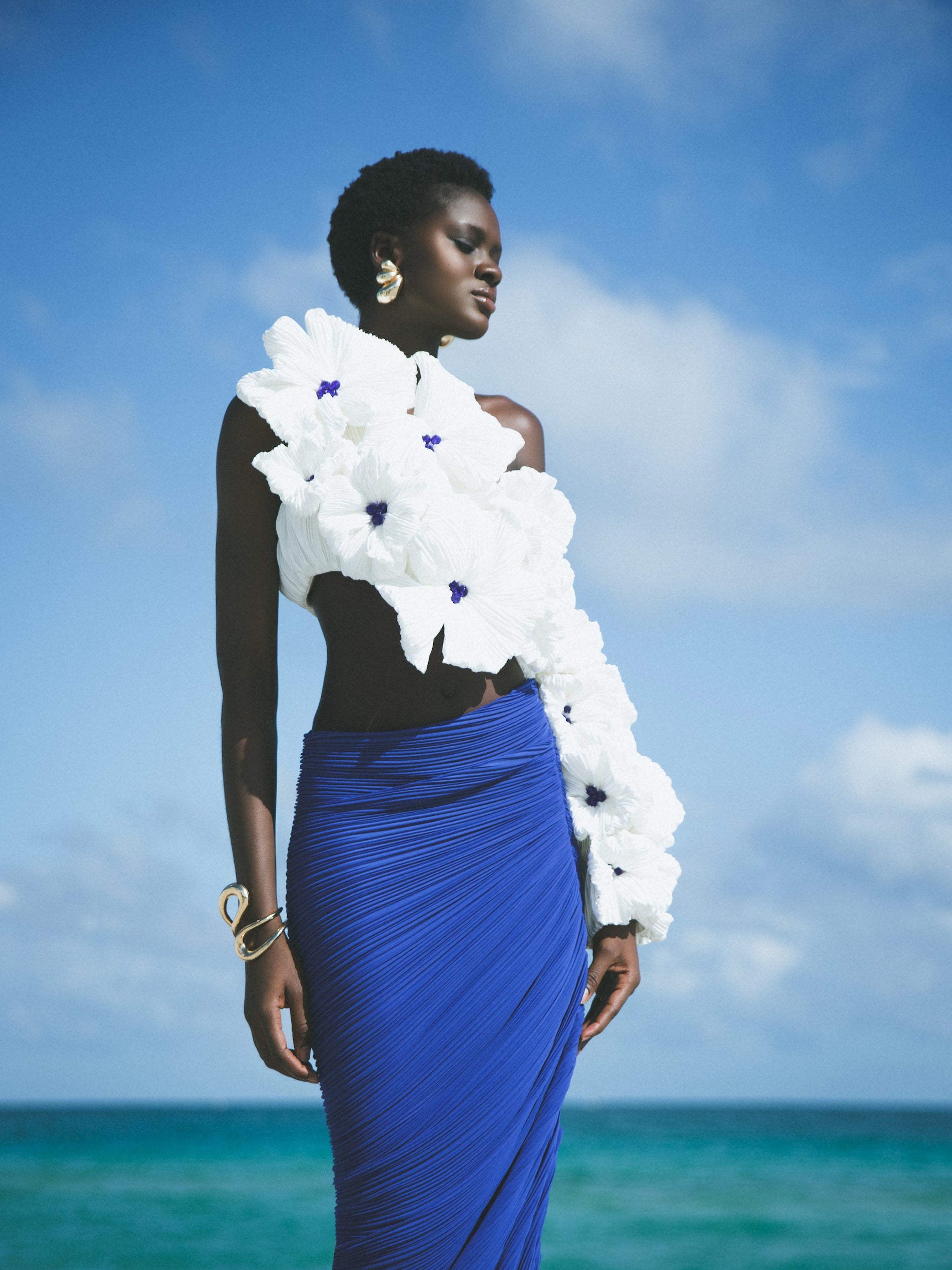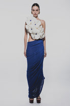 crafted from delicate 3D handmade flowers with our signature mushroom pleat featuring hand beaded crystal beads delicately in each flower. Mazu also featured an Asymmetrical ruched skirt with slit on the side.