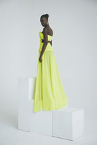 Lauryn wears our maxi-length skirt with pleated ruffle at the waist, completely sheer, silk georgette, and thigh-high slit.