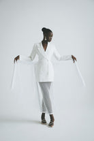 Lauryn wears our double-breasted, long sleeves, cut-out panels blazer with long fringe at the sides. Fully lined, curved hem.
