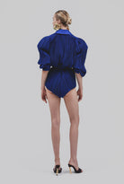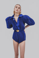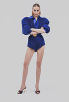 Fully pleated and fully lined jumpsuit featuring exaggerated sleeves, belt with gold metal leaf pin at the waist, button closure at the front for easy access.This style fits true to size, we suggest taking your normal size.