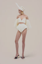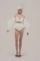A fully pleated and fully lined off-shoulder crop top featuring exaggerated triangle detachable sleeves, featuring split detail at the end of sleeve